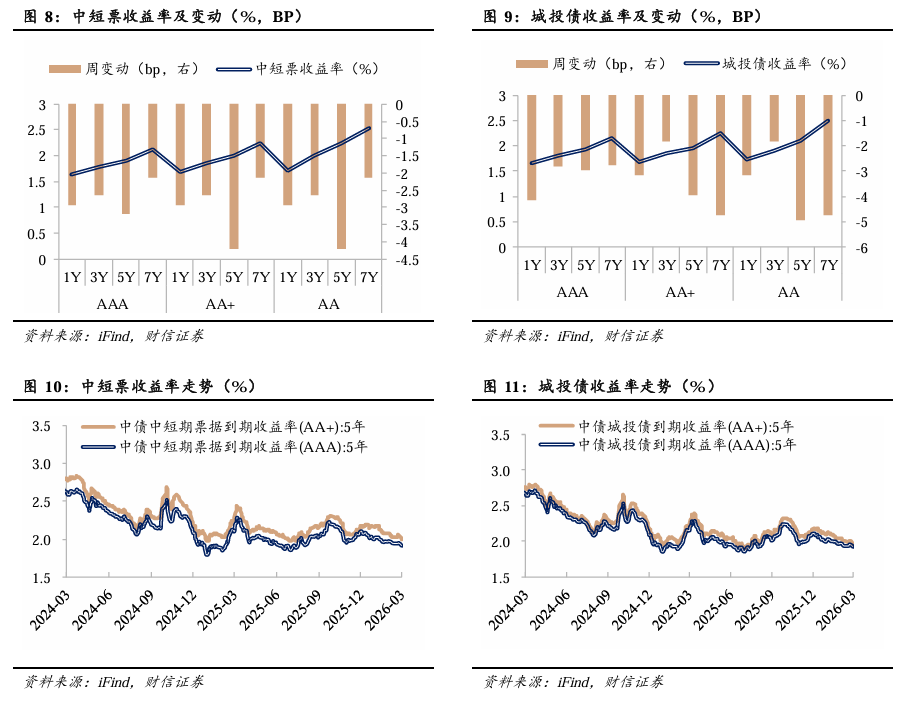 中短票及城投债收益率整体下行。截至3月6日,中短票收益率多数下行,5年期AA+、5年期AA和5年期AAA品种收益率下行幅度较大,较前一周分别下行4.20BP、4.20BP和3.20BP。城投债收益率整体下行,5年期AA、7年期AA+及7年期AA品种收益率下行幅度较大,较前一周分别下行4.95BP、4.74BP和4.74BP。