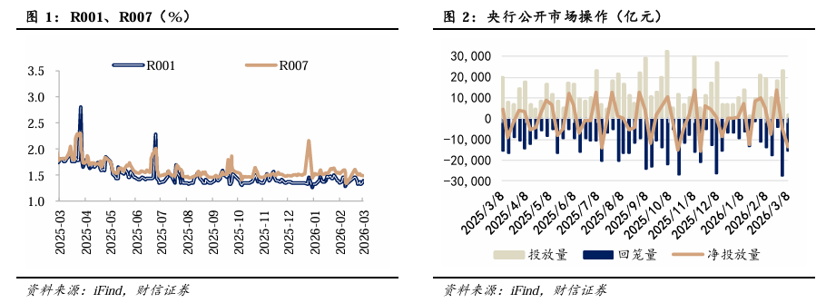 央行公开市场净回笼13634亿元,资金面整体宽松。截至2026年3月6日,R001收于1.39%,较前一周上行4.8BP;R007收于1.49%,较前一周下行1.5BP。上周央行通过公开市场操作净回笼13634亿元。