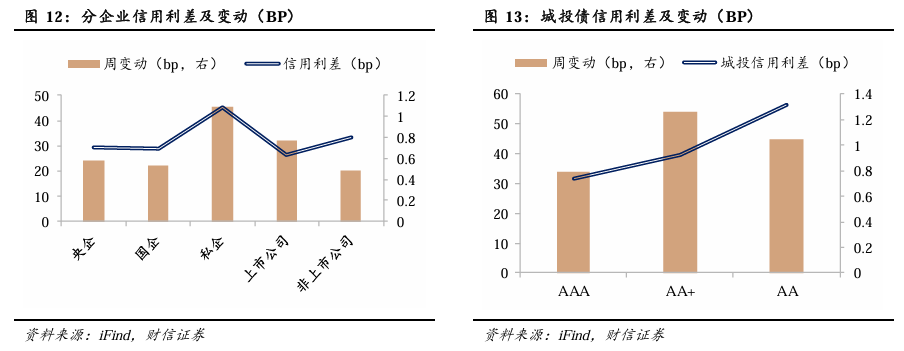 各类型企业债券及城投债信用利差整体上行。截至3月6日,分企业性质信用利差方面,上周各类性质企业信用利差整体上行。其中,私企发行的债券信用利差上行较多,上行幅度为1.09BP。城投债方面,上周城投债信用利差整体上行,其中AAA品种信用利差上行0.8BP,AA+品种信用利差上行1.26BP,AA品种信用利差上行1.05BP。