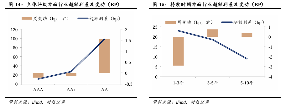 行业超额利差涨跌分化。截至3月6日,从主体评级来看,AAA级品种超额利差较前一周末下行0.21BP,AA+级品种超额利差较前一周末下行0.13BP,AA级品种超额利差较前一周末上行1.55BP。从品种到期时间上来看,1-3年期品种超额利差较前一周末下行2.89BP,3-5年期品种超额利差较前一周末上行0.73BP,5-10年期品种超额利差较前一周末上行0.34BP。