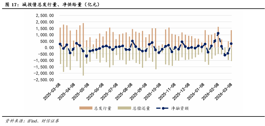 上周信用债发行规模较前一周上升,净融资量上升。上周信用债新发行规模为2631亿元,前一周为948亿元,净融资规模为794亿元,前一周为-663亿元。