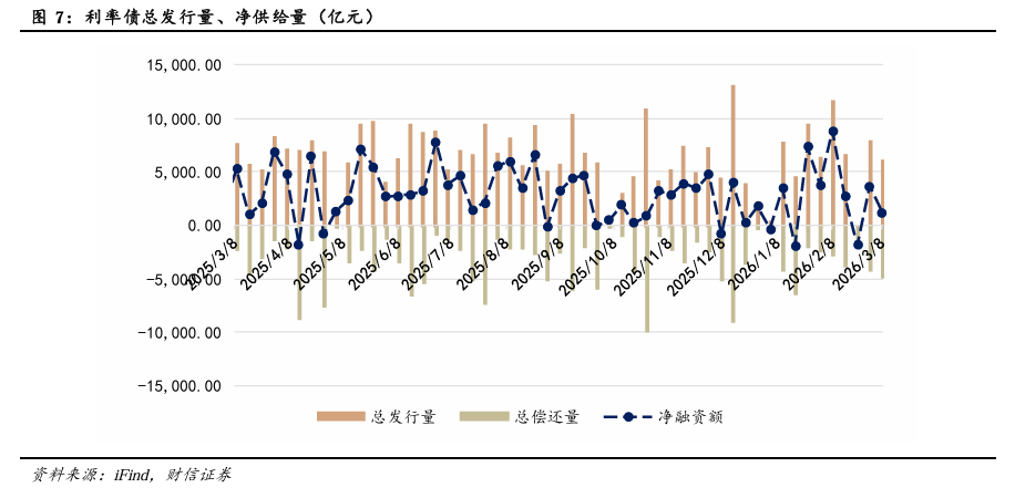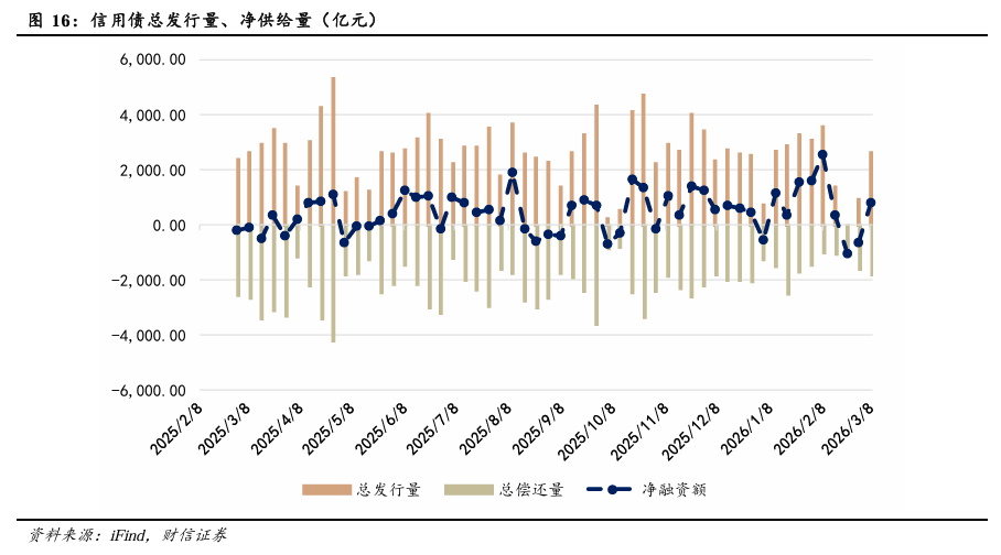 对债市而言,通胀隐忧扰动债市。政策方面,上周两会圆满召开,《政府工作报告》对于2026年经济增长、财政政策及货币政策等领域都作出了明确部署:将经济增速目标设为区间值,为后续政策应对及经济建设预留更大的灵活性与弹性,经济增速目标对债市而言影响偏中性。同时,财政政策方面,4%的狭义赤字率及8.1%左右的广义赤字率同样指向今年财政政策着重保持“必要性”,重在优化支出结构,中长期对债市形成“上有顶”效果。但值得注意的是,《报告》对总量型货币政策着墨偏少,强调后续增加结构性货币政策的使用及规模,更加注重定向发力,或导致短期市场押注央行降准、降息的预期边际回落,短期对债市影响偏空。总体而言,我们认为年内降准、降息仍有空间,但节奏可能放缓,央行将综合后续经济发展及风险扰动来相机决策,或采取先降准后降息的顺序。通胀预期方面,近期美伊冲突持续扰动市场,油价快速走高,叠加2月物价数据表现超市场预期,推升市场对通胀快速回升的担忧。整体来看,在需求端回升之前,我们认为供给推动型通胀对债市的实际压制或有限。2月CPI同比录得1.3%,前值0.2%,市场预期0.9%,PPI同比-0.9%,前值-1.4%,市场预期-1.1%。当前来看,假设后续PPI环比以0的速度外推,则PPI同比将于5月回正。同时,考虑到我国PPI直接覆盖的能源行业权重高达约16%左右,且当前美伊冲突导致的霍尔木兹海峡封控仍在持续,我们认为后续视国际能源供需调整变化,不排除PPI同比回正时点或进一步提前,短期10年期活跃券利率向下突破难度较大,曲线易平坦化,但整体风险尚可控。
