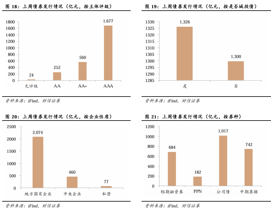 按企业性质来看,上周地方国企新发行2074亿元,央企发行460亿元,私营企业发行77亿元。按债券种类来看,上周中票发行742亿元,公司债发行1017亿元,短融发行684元,PPN发行182亿元。